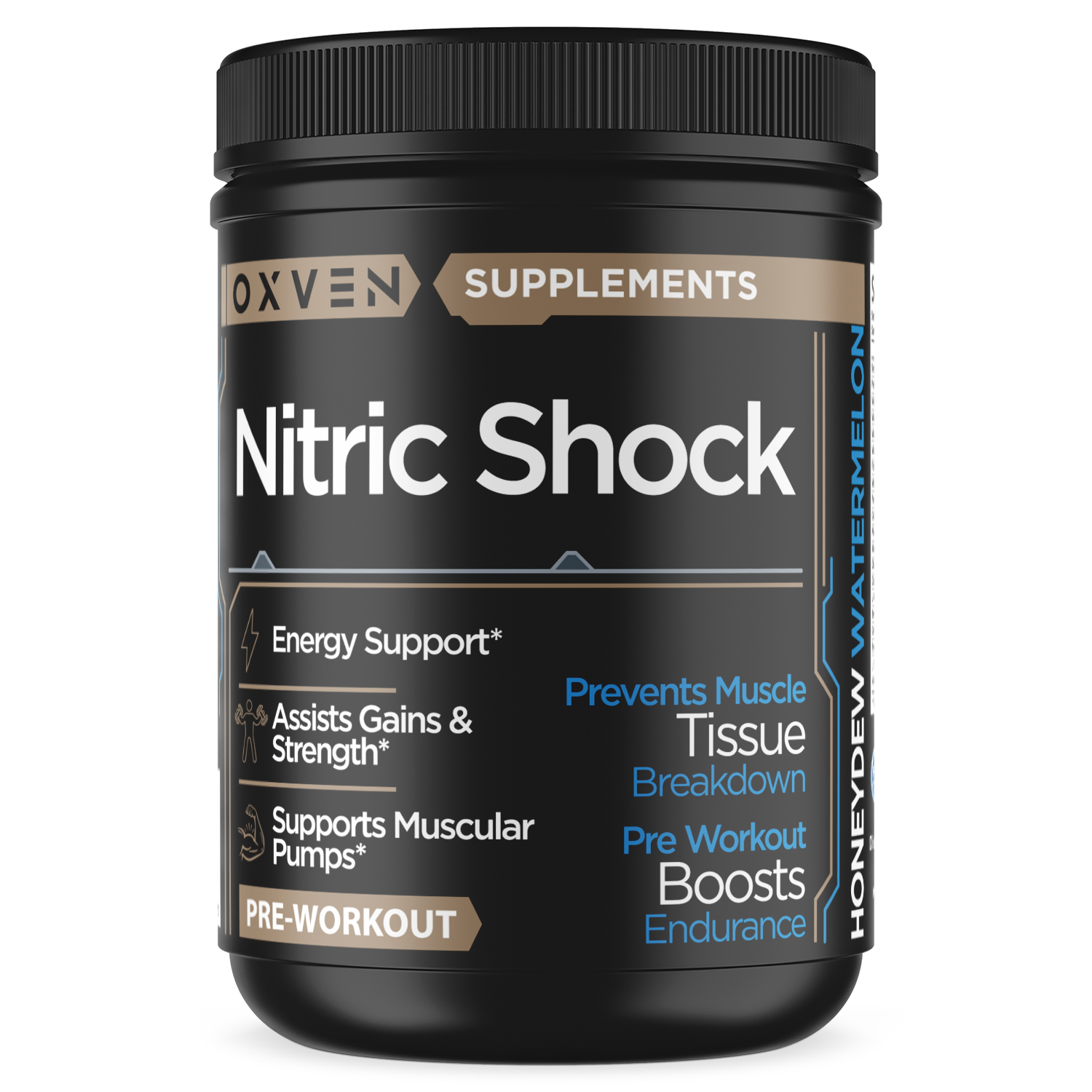 Elevate your workout intensity with Nitric Shock, a powerhouse supplement designed to boost exercise performance, enhance muscle synthesis, and increase energy and cognition. Formulated with optimal ratios of branch chain amino acids and based on the latest scientific research, Nitric Shock helps you achieve peak performance and the ultimate pump. Rigorously tested and produced in a GMP-certified, FDA-registered facility in the USA, our supplement sets the gold standard in fitness enhancement. Experience the difference with Nitric Shock and take your workouts to new heights.